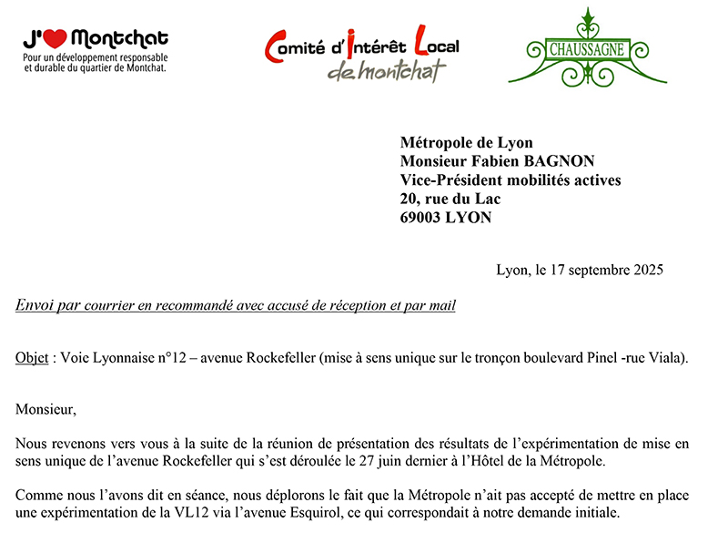 Courrier du 19 septembre 2023 à la Métropole de lyon - Voie Lyonnaise n°12 - avenue Rockefeller (tronçon boulevard Pinel - Place d'Arsonval)